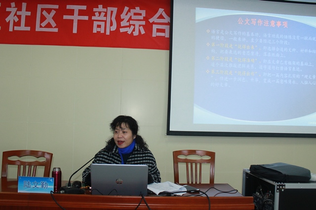 培训班开设了党建基础、公文写作、财务管理等九门课程,11月27日和11月30日的两次培训正是这九门课程中的《公文写作》部分,由陆文勤老师授课。陆文勤老师是江阴市教育局职社科副科长,同时也是江苏省作家协会会员,江阴市作家协会第七届理事会主席,笔名“雯清”,出版散文集《清水浮香》、《心底花开》等作品。两次培训,陆文勤老师以扎实的功底、幽默的语言、形式多样的授课技巧深入浅出的讲解了应用文、行政公文、常用事务文书等内容,重点讲解了公文写作中的数字使用、最常见的标点错误等注意事项。严严冬日,陆文勤老师的课却在社区干部的心中掀起了公文写作的激情!滨江社区梅雪虎表示“非常实用,谢谢陆老师!”蟠龙社区陈蓓、王玲、陈志宇等更是慕名前来听课。