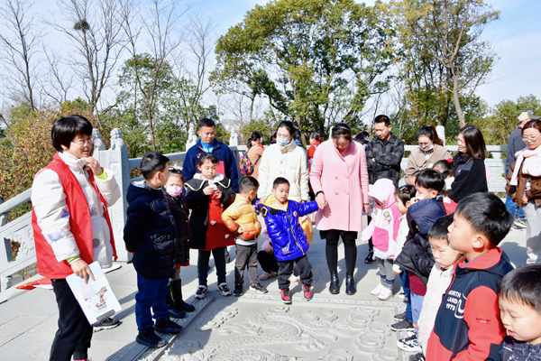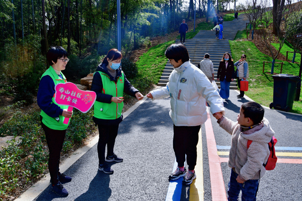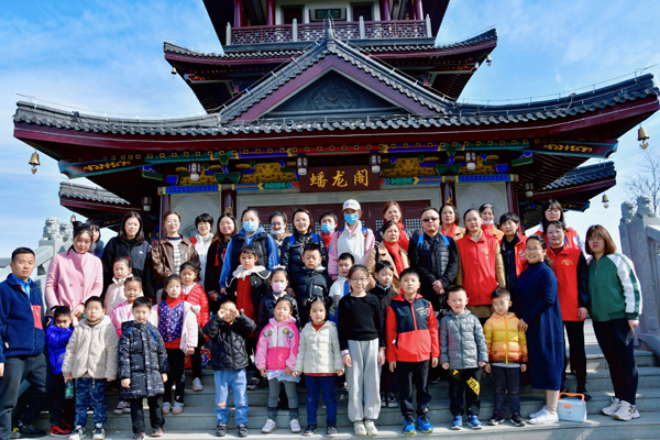 当天早上8点半,随着“队伍集合完毕,第一站——蟠龙阁,出发!”的出征号,“亲子花”团队在义工老师的带领下登上蟠龙阁, 志愿者黄兰芬老师具体讲述了蟠龙山名称的来历、公园的布局与设计理念;义工许爸在蟠龙阁下发出号令:徒步开始,沿彩虹跑道逆时针方向徒步,沿途在3个道路分叉点设计打卡活动,有义工为孩子打卡,并告知行走路线;最后大家在蟠龙山公园东广场集合。一场徒步探寻,一片欢声笑语,一派热闹景象。活动中,家长们带领着孩子边走边欣赏,每到标志性建筑或者有意义的地点,他们都会停下来为孩子讲解,拍照打卡、欣赏建筑、聆听故事……孩子们恣意享受春日暖阳,被每一处景点吸引着、感染着、陶醉着,他们有说有笑,充分沉浸在徒步活动带来的无穷欢乐之中。