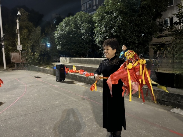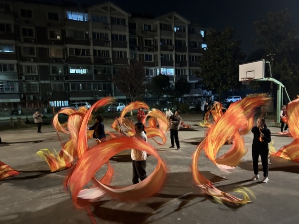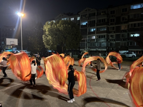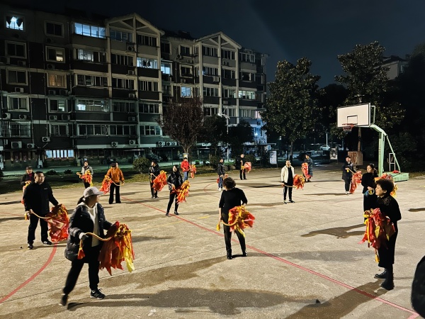晚上7:00-8:00,在江阴高新区南苑二村广场上,教练耐心讲解与示范,学员们左手执彩带龙,右手握绳,手臂摆动“∞”型,通过脚步变动、腰部扭动等要领挥动彩龙。“彩带龙”在学员们的手里像是活了起来,虎虎生威,火红色的飘带让整个广场也跟着生动起来,引来众多居民围观。